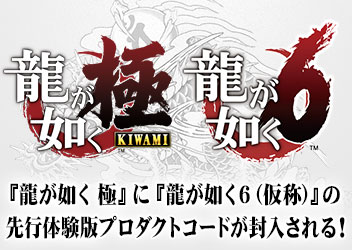 『龍が如く 極』の封入特典としてプロダクトコードが同梱される、PlayStation®4専用ソフトウェア『龍が如く6(仮称)』先行体験版を、2016年1月28日(木)正午頃から配信することを決定いたしました。