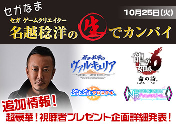『龍が如く』シリーズ総合監督の名越稔洋がMCを務めるゲーム情報バラエティ「セガなま ~セガゲームクリエイター名越稔洋の生でカンパイ~」 毎月セガゲームの情報を皆さんにお届けします。 番組では、皆さんからの質問に名越総合監督が本気で答える「名越に生で訊け!」のコーナーを行います。