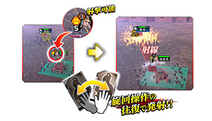 「射撃」は、敵部隊に照準が合っている状態で、カードの旋回操作の往復を行うことで発動します。