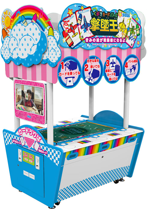 お絵かきしたカードから絵が飛び出して、複数の戦闘機とバトルを繰り広げるらくがきカードバトルのアミューズメントマシン。