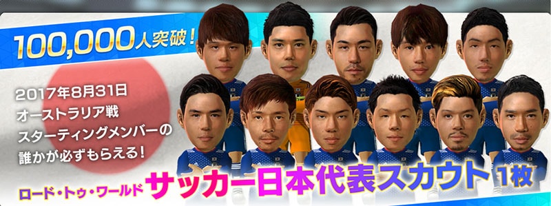 | 100,000件突破 | ロード・トゥ・ワールド サッカー日本代表スカウト 1枚 | 2017年8月31日実施のオーストラリア戦の日本代表 スターティングメンバーの誰かがもらえるアイテム |