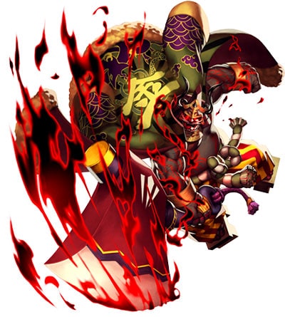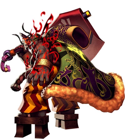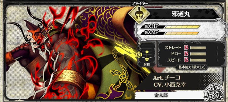 「邪道丸」は、酒呑童子の魂に取りつかれ復讐の鬼と化した「怪童丸」のアナザーキャスト。蛇のような眼光が怪しく光る、鬼神の面を被ったファイターです。