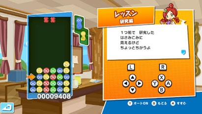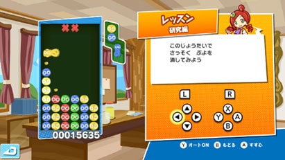 『ぷよぷよ』を初めて遊ぶ人や連鎖が苦手な人でも、基本的な操作方法やルールを覚えられる、「レッスンモード」を新規収録。「基本」「応用」「研究」の3段階から段階的に学ぶことができます。「かいだんづみ」「はさみこみ」「おりかえし」などの連鎖するために必要な基本をレクチャー。さらに「問題」では、実際にプレイヤーが操作して学ぶことができます。ぷよぷよの基本や連鎖の組み方などを一から学べるので、初心者でも安心のモードです。