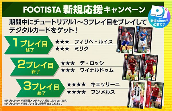 - 該当期間内に「FOOTISTA」をプレイしていない新規Aimeカードでチュートリアル1~3プレイ目をプレイしていただいた方にデジタルカードをプレゼントいたします。