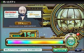 溜めたガチャゲージ1本で「思い出ガチャ」を1度回すことができ、1日最大15回までガチャを回せます。また、毎日初回ログイン時には、「思い出ガチャ」1回分のゲージが溜まった状態から開始されます。