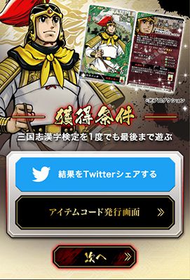 問題の正解状況によって「三国志漢字検定」内限定の異名や、『三国志大戦』で使用できる称号や武将カード『LE劉備』も獲得できるので三国志ファンやこれから『三国志大戦』を始める方でも楽しめる内容となっています。