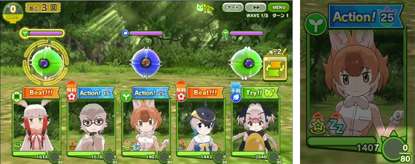 バトルはターン制コマンドバトルとなっており、フレンズたちの攻撃→セルリアンの攻撃、の順で進行されます。アイコンをタップすることでコマンドが選択されます。1ターンにつき、行動できる回数は基本3回までで、1ターンに同じフレンズを3回選択することもできます。