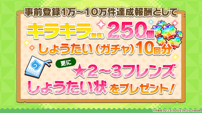 『けものフレンズ3』事前登録15万件達成に感謝を込めて、ゲーム内キャラクターである★3「トキ」やしょうたい(ガチャ)10回分相当の「キラキラ」250個、★2~3のフレンズの中から一人をお迎えできる「フレンズしょうたい状」などの事前登録報酬を、アプリ版『けものフレンズ3』をダウンロードした全ユ ーザーにプレゼント! なお、こちらのプレゼントはアプリ版『けものフレンズ3』のチュートリアル突破後に受け取ることが可能となります。