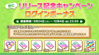 リリース時より累計14日間アプリ版『けものフレンズ3』にログインする事で、しょうたい(ガチャ)に使用する「キラキラ」が最大348個と、「しょうたい券」10枚が贈られます。事前登録報酬の「キラキラ」 250個を合わせると、合計33回分のしょうたい(ガチャ)が可能です。さらに、9月24日(火)から10月4日(金)の期間内に累計7日間ログインすると、10枚集めることで★4フレンズが必ず一人しょうたいできる「すぺしゃるしょうたいチケット」を最大7枚獲得できるキャンペーンも合わせて開催します。
