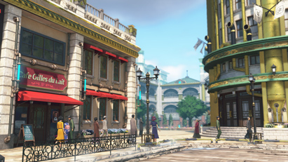 左手に「カフェ・ジル・ド・レ」、右手には「銀六百貨店」。奥には小さな広場があり、人々でにぎわっている。
