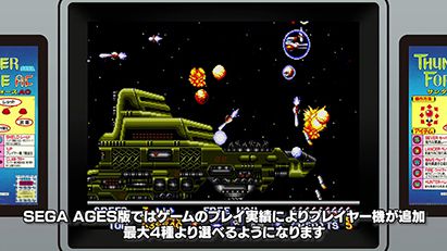 SEGA AGES版では、アーケード版『サンダーフォースAC』を忠実に移植した「アーケードモード」が楽しめるのはもちろん、プレイヤー機の攻撃力アップなどを行った低難易度の「KIDSモード」が実装されています。また、アーケード・KIDSモードのプレイ実績によりプレイヤー機が追加されていき、STYXMass Product、RYNEXなどの最大4種より選べるようになります。