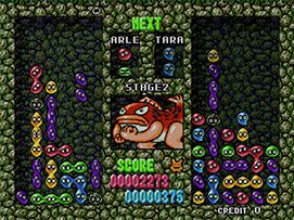 (1992年稼働開始/ジャンル:パズル/最大2人プレイ)落ちものアクションパズルゲーム。消して、じゃまして燃える対戦!同じ色のぷよぷよを4つ以上、つなげて消していこう!
