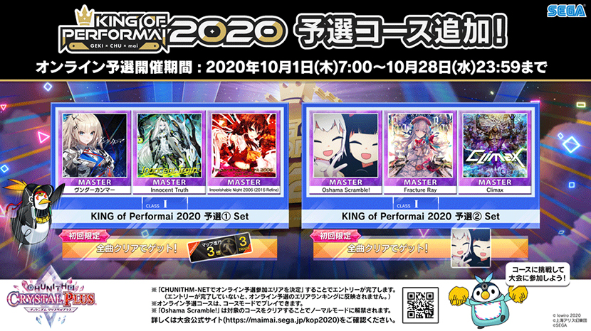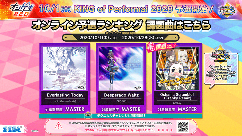 オンライン予選期間中に課題コース「KING of Performai 2020 予選②Set」をクリアすると、楽曲「Oshama Scramble!」が先行プレイ可能になります!