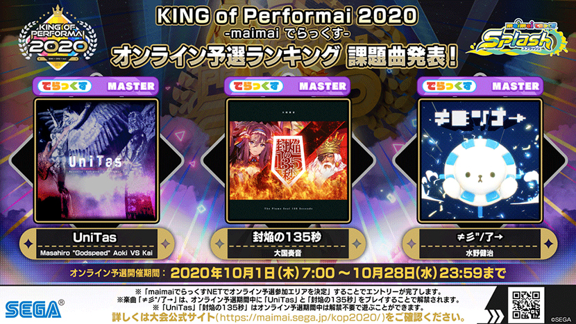 株式会社セガは、アーケード音楽ゲーム『オンゲキ』『CHUNITHM』『maimai でらっくす』の公式全国大会『KING of Performai 2020』を開催いたします。