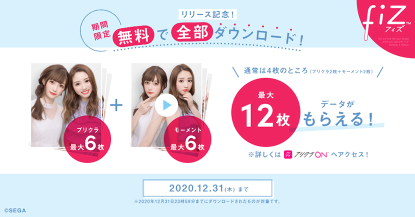 最新プリクラ機『fiz(フィズ)』の稼働を記念して、期間限定で「プリクラON 」でプリ画像とモーメントの全データ無料ダウンロードキャンペーンを実施いたします。