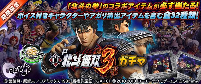 ボイス付SPキャラ「ケンシロウ1 真・北斗無双3」や、アガリ演出アイテム「真・北斗無双3(PUSHボタン)」をはじめとするコラボアイテム32種が期間限定で登場します。