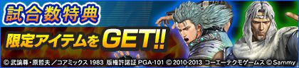 パチンコ「P真・北斗無双 第3章」のボイス付SPキャラ、SPキャラ、EX背景アイテム、卓背景アイテムが試合数特典として獲得できます。