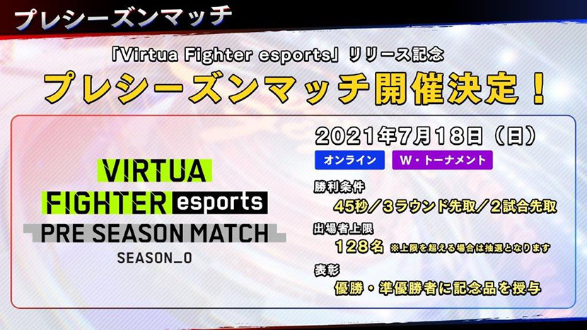 2021年7月18日(日)に、「VIRTUA FIGHTER esports CHALLENGE CUP SEASON_0」のプレ大会を開催いたします。バーチャファイターeスポーツ コミュニティサイト「バーチャファイターキャンプ」にてエントリー受付中ですので、ぜひご参加ください。