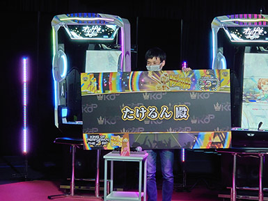 中盤まではお互い初見とは思えないプレイで競るものの、「TSUBAKI.」選手がリードを維持し、誰もが「TSUBAKI.」選手の勝利を予感した。しかし、曲の最終盤、一瞬崩れた「TSUBAKI.」選手がスコアを落とし、最後まで粘り強く初見譜面に食らいついた「たけるん」選手が2曲目までの点差を覆す大逆転。「たけるん」選手が、3タイトルで決勝出場という偉業に加え『オンゲキ』部門優勝の名誉を手にした。
