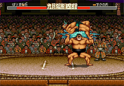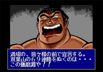メガドライブ最大の問題作、「遊ぶと強くなる横綱ゲーム」が登場。さだやす圭の人気漫画を原作に、型破りの横綱・播磨灘となって、双葉山の記録を破る70連勝を目指します。2人対戦も可能な対戦格闘です。