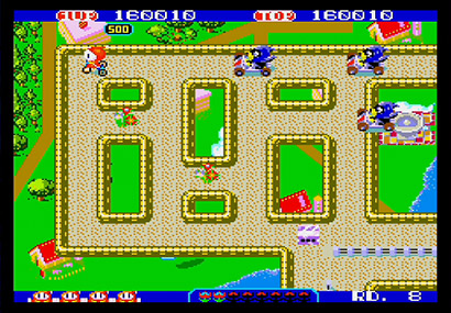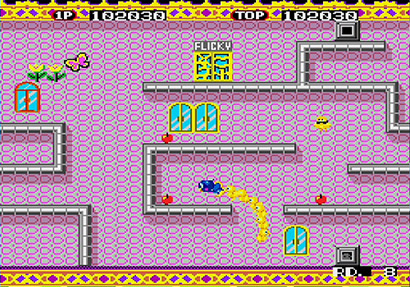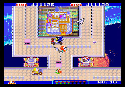 三輪車に乗ったサンちゃんを操作して、迷路にあるすべての花を集めて進む、かわいらしいドットイートアクション。ピンチになったら、フェンスへジャンプして、敵をはね飛ばすことも。1984年のアーケードゲームを、初めて移植しました。