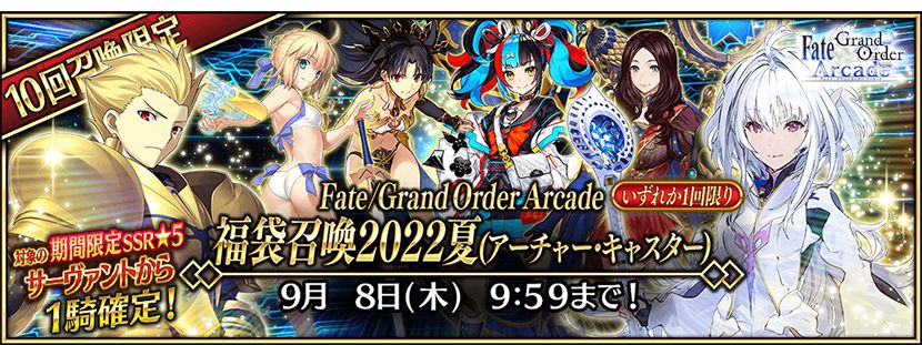 期間限定「Fate/Grand Order Arcade 福袋召喚 2022 夏(クラス分類別)」の詳細は『FGO Arcade』公式サイトのお知らせをご確認ください。