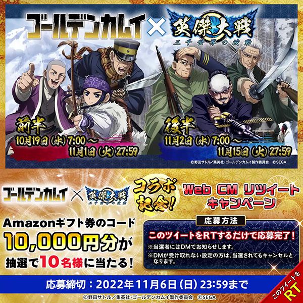 また、コラボ開始を記念してTwitterキャンペーンを開催。『英傑大戦』の Twitter 公式アカウントをフォローし、対象ツイートを RT していただいただくと、抽選でAmazonギフトコード10,000円分をプレゼントいたします。