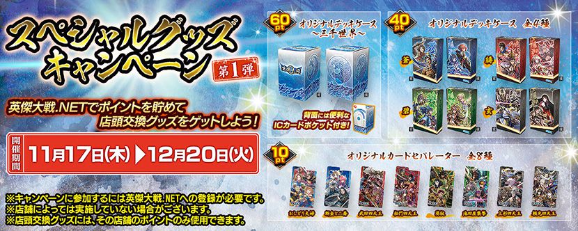 本キャンペーンは『英傑大戦』初となるグッズ獲得キャンペーンです。Web連動サイト『英傑大戦.NET』に登録し、期間中にキャンペーン実施店舗にてゲームをプレイしポイントを貯めると、ポイントに応じてICカードポケット付きの「オリジナルデッキケース~三千世界~」や各勢力の武将が描かれた「オリジナルデッキケース」、「オリジナルカードセパレーター」といった『英傑大戦』スペシャルグッズを獲得することができます。