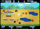 恋する女の子“パプリちゃん”を操作して満開の花を摘み、“ミント君”に花束をプレゼントする横スクロールのアクションゲーム。 パプリちゃんが花を摘んでいるとクマが邪魔をするけれど、ハチが運んでくれるハチミツを使うことによって、クマをやりすごすことができる。 また、タイマー代わりである恋敵の“コッコちゃん”が先にプレゼントを渡してしまっても恋は成就しない。 ……こんなほのぼのとした設定も魅力のひとつである本作品は中裕司氏の処女作であり、黎明期の傑作だ! |