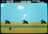 中■ここに“コッコちゃん”というライバルがいて、ミント君に花を持ってせまってきているというタイマーがあるわけです。 これに負けないようにパプリちゃんは花を摘んでミント君に渡さなければいけない……という、なんというか今考えても素晴らしい企画というか、感覚的なものとしては最高なものがあるなと(笑)。 しかもクマやハチから逃げながら花を摘まなければいけない。これもね、「花と言えば、ハチが蜜を吸いにくるよね」とか、「蜜と言えば、クマが大好きなものだよね」なんて言いながら決めていったんです。 ―― タイマーも数字ではなく、目で楽しめるのがいいですね。技術的には、動かすものが増えて大変そうですけど。 中■マシンスペック的にもスクロールすること自体が大変だったので、かなりの工夫をしてパプリちゃんもハチもクマも画面に表示するようにしました。 SG-1000ではスプライトを4枚しか出せないのですが、パプリちゃんにまず2枚使っているわけですよ。白とピンクで。 それからハチ1匹で1枚。そうするとクマを3頭とか出せないわけですよ。 それでクマはスクロール面(BG面)で書いているんです。当時としては高度な技術で、これは宮内がやっていました。 BG面ではスクロールしながら花は咲くし、クマも2頭3頭と動き回るので、ずいぶんトラブってしまいました。 ……結局、宮内はクマにかかりっきりでしたね(笑)。 |