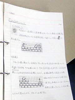 | ■『どきペン』の企画書を眺めながら ―― よくこんな18年前の企画書が残ってましたね! 小口■本当だねぇ(笑)。 ―― すごく細かい! ペンギンやタマゴのドット絵もあるし(笑)。 小口■企画の人間が16×16のドットを埋めていって描いていた。その頃は完全に分業化されていなくて、デザイナーに言っても全部やってくれなかった。「手あいてたらやってよ」って言われて、「ペンギンはこの目、もう1ビット消しでしょ」とかやってた(笑)。 すげ~、ひさびさに“フェアリー”見ちゃった。 ―― キャラのネーミングも小口さんですか? 小口■この“アデリー”と“フェアリー”は俺が名前つけたわけじゃなくて、昔はマニュアルだけ書いてた人がいて、その人が考えてきてたんだと思う。“フェアリー”っていう発想が俺にはないからね。俺のなかにはいまだにそういう言葉がないから、俺がつけたんじゃないことはわかる。 “ペンタ”だったら、つける可能性はあるけど(笑)。 ―― じゃ、タイトルは? 小口■タイトルは当時のTV番組で『わくわく動物ランド』っていうのがあって、それが頭の片隅にあった(笑)。 ―― ルールの設定も細かい指示でびっしりですね。 小口■企画書もね、本当に細かいところまで書いた。 ほら、「敵のパンチを受けたときに、4セル飛ばされ、約1秒間コントロール不能になる」って書いてある。そういう指示も企画がやってたし、ゲーム中もそのまま再現されてるでしょ。 「タマゴと岩石は押せる。障害物があった場合はその位置で停止」 「なおかつ、必ず横になって停止しろ」 「ブロックとブロックの間はには不都合があるので、絶対に停止しないでくれ」 「タマゴの転がりは8パターンで。(でも容量が足りなかったら4パターンでもいいよ)」 ほら、デザイナーにスプライトパターン伝えるのに、「歩きは2パターン、すべりが1で左右があって、全部で28枚必要」……あ、スプライトの整理番号まで企画が作ってる! ……要はここまで企画がやらなくちゃいけなかったんだよ。それがスゴイよね。 ―― それは企画した人にもよるんじゃないですか? 中さんは企画書らしいもの書かないでプログラムしていったとか話されてましたし……。 小口■うんうん、逆に言っちゃえば、俺はプログラマーにならなかったので、自分でできないからね。変にされちゃ嫌だから、これだけ注文が多いんだよ。 トータルとしてパズルになってるんで、たとえばタマゴひとつ変な風に動かされると、パズル成り立たなくなるじゃん。だから、こういうように指示してるんだと思う。 プログラムの勉強は、入社して3ヶ月くらいはみんなで研修してZ80かなんかのアセンブラをやってたんだよ。弾を撃って、オブジェクトに当たって、当たり判定して、そのオブジェクトを消して、点数を上げるくらいのところまではやったね。 だけど性格的に企画のほうがいいやって。自分の意志で作れるからって当時は思ってて「俺は企画に行く」と言ったんだよね。 ―― なるほど。 小口■あ、ボツったゲームの名前があった。……『ペンギン村はラブ戦争!』 わははは、この時からすでにフェアリーいるじゃん。ストーリー的には彼女のところへ行くっていうのはあったんだ。 ―― どちらもゴールで女の子が待っているんですね(笑)。 小口■いや、目的はわかりやすいほうがいいからね(笑)。 |
