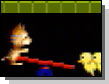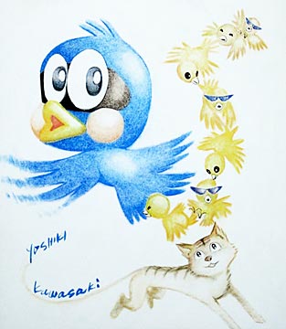 フリッキーがスズメであり、ピヨピヨの親ですらなかったことは、正に衝撃の事実でした。わたしはズット、ツバメかなにかの親子かと思ッて居ました。 暗く殺伐としたゲームが多いなか、『フリッキー』は、見ためにもテーマ的にも異彩を放ッて居ました。当時は、あまりゲームにふれる機会がなかったのですが、このゲームに関しては、はじめてアーケードで画面を観たときから強く印象に残ッております。 まあ、ニャンニャンは「餌」を狙ッて居るのかも知れないんですから、このゲームにも、ある意味 残酷な部分はあるのですが...今回、川崎さんが描いた色紙のニャンニャンを拝見して、その印象も変わりました。なにやら、追いかけっこして戯れて居るようですね。 (匿名希望・男・30)