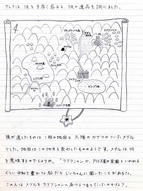 オサール■“おにぎり”は地球における日本の食習慣ですが、アリエス星にも同じ食習慣をもつ島があったのです(笑)。アレクがいつこの食べ物を好きになったかは正確にはわかりませんが、国王であったアレクの父サンダーは異文化を取り入れることに熱心だったので、アレク王子はそのうちに“おにぎり”を食べ、大好きになったと考えられますね。 |