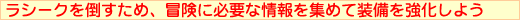 敵を倒して稼いだメセタ(お金)で冒険に必要な準備を整えよう。ほとんどの武器・防具はショップで手に入れることができるが、なかには洞窟などに隠されているものもある。戦闘中以外であれば、各キャラクターの能力を確認したり手に入れた武器や防具を装備することができる。