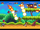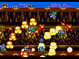 ハードの限界をものともしなかったのも『ガンスターヒーローズ』がメガドライバーのハートを鷲掴みにした理由のひとつでもありました。8Mbit [注1] という小さなROM容量とは思えないバラエティに富んだゲーム内容。ダイナミックかつ、滑らかに動きまくるボスキャラ。メガドライブの機能一覧を端から端までひっくり返してみても載っていない拡大縮小そして回転、すべてがちょっとした閃きと工夫とめんどっちい手間の積み重ねで、出来ています。