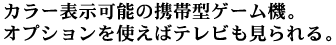 国内の携帯ゲーム機では初めてとなるバックライト付3.2インチカラー液晶ディスプレイを搭載。別売のTVチューナーパックを装着すれば携帯テレビとしても使用することができる。バッテリーパックやカーアダプタなど、屋外で使用するためのアクセサリーも充実。