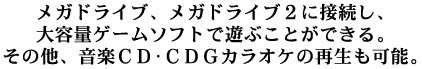 メガドライブに接続することにより、CD−ROMソフトで遊ぶことができる。専用のCPUを搭載することで、画像の回転・拡大・縮小がハードウェア側で処理できるようになった。ハード登場時からソフトライセンシーも本格参入し、長編RPGやアドベンチャーゲームも多数登場。大容量を活かした画面描き換えによるアニメーションや動画圧縮技術を用いた作品も登場し、現在では定番となった“オープニングムービー”などの基礎を作り上げた。