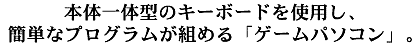 専用のモニタがなくても家庭用のテレビに接続してパソコンとして使用でき、専用のカートリッジを挿せばゲームも楽しむことができる「ゲームパソコン」。また、プリンタやデータレコーダなど豊富な周辺機器(別売)と接続することで、さまざまなシステムアップを図ることができた。