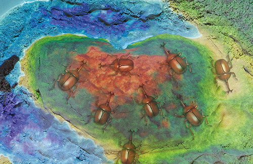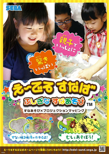 - 砂遊びとプロジェクションマッピングが融合した新感覚の室内用キッズ向け遊戯機器。 砂の上にプロジェクターで映像投影。砂を掘ると川や湖、海になり、積み上げると山になるなど、プロジェクションマッピングによる映像技術の応用により、砂の造形変化に応じて投影される映像がインタラクティブに変化する。工夫すれば立体的なお絵書きも可能で、想像力を膨らませて遊ぶことができる。 砂はスウェーデンで開発された不思議な砂「え~でるサンド」。水が無くても造形が可能で、手につきにくく、汚れを気にせずに砂遊びできる。 テーマに沿った絵を砂で描いて遊ぶ「できるかな」モードと、砂の形状に合わせて四季を体感できる映像(紅葉や桜、季節の虫など)と共に自由に砂遊びする「すなあそび」モードから選択して遊ぶ。