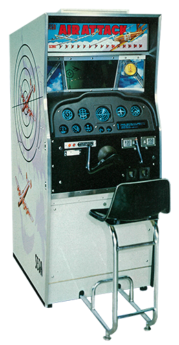 - アイデアと技術が大空中戦を再現!!立体模型の敵機が明るい画面を自由に飛び回る! 操縦桿を引くと飛行機が上昇、押すと降下、まわすと旋回。飛行機を操縦して逃げる敵機を照準の中央に捕え、ボタンを押して機銃戦を浴びせる。命中すると敵機は大音響とともに爆発、墜落する。 ドラムユニットを独自に開発したことで、敵機の姿をシルエットではなく立体模型とすることが可能に。そのうえ本物そっくりの上昇、降下、旋回しながら、空中を自力で飛んでいるように見える。 2枚のハーフミラーを使い機銃発射の閃光、敵機と雲、命中爆発の光の3つを合成し、迫力ある大空中戦を再現。