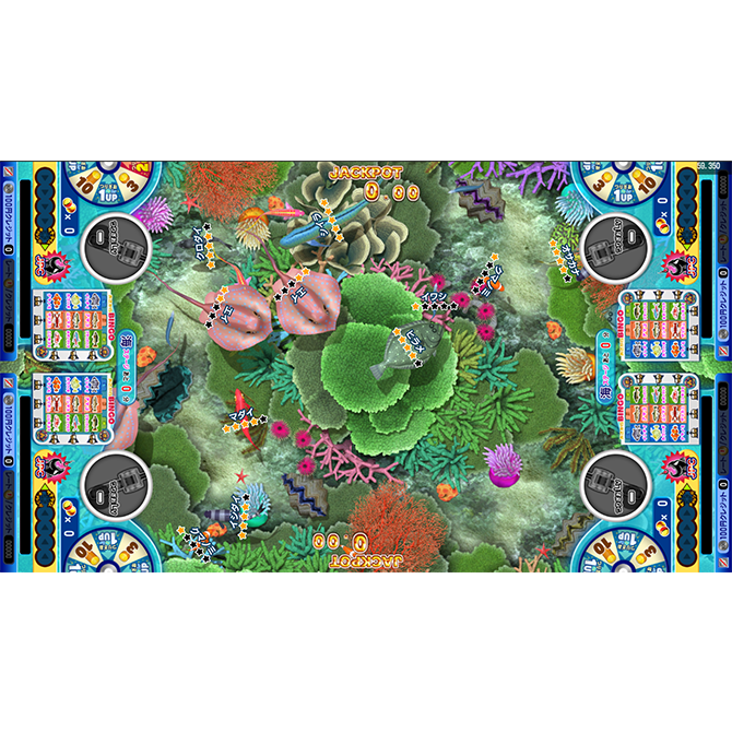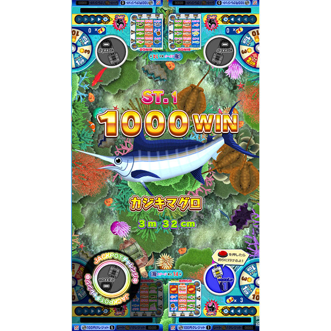 フィールドからボールを落として釣りゲームを行い、いろんな魚を釣り上げよう! 見事ボス魚を釣り上げるとジャックポット獲得で大漁メダルゲット!!図鑑や釣り大会などなが~く遊べるやり込み要素も満載。