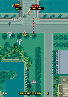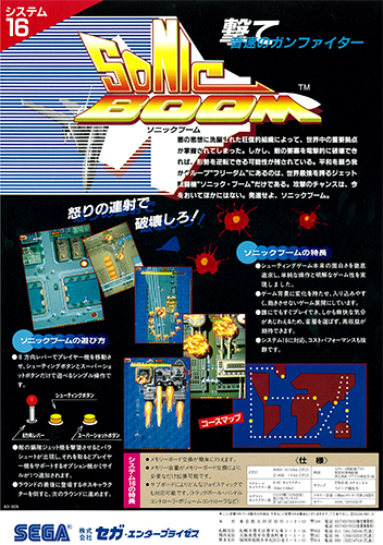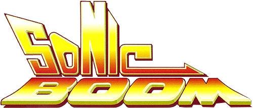 平和思想グループの戦闘機、ソニックブームが悪の組織と戦うシューティング。 赤いパラシュートを取ると護衛機がつき、この数でスーパーショットが3種類に変化。全6面で、背景にペルシャ湾、日本上空などが現れる。ボス戦では、ボスの耐久力がゲージによって表示されているのが特徴。