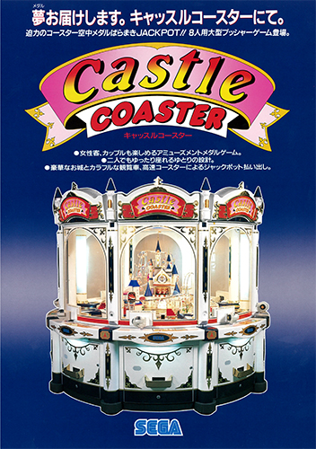 - 夢の世界へプレイヤーをいざなう8人用大型プッシャーゲーム。 多様なからくりで楽しめる巨大なお城、メダルを積んだままループする高速コースター、カラフルな観覧車が目を引く。 ルールは簡単、タイミング良くメダルを投入してプッシャーでメダルを落とす。3つのうち1つ点滅しているターゲットにメダルをのせるとルーレットが回り、すごろくでお城までたどりつくとスーパージャックポット「キャッスルコースター発進」が発動する。
