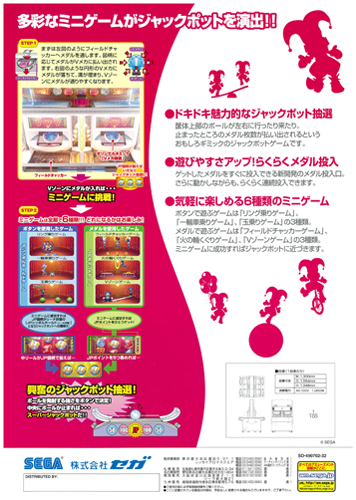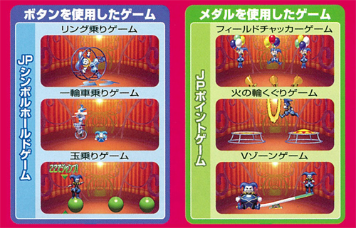 - 多彩なミニゲームがジャックポットを演出。 筐体上部のボールが左右に行ったり来たり。 止まったところのメダル枚数が払い出されるという おもしろギミックのジャックポットゲーム。 気軽に楽しめる6種類のミニゲームは、ボタンで遊ぶ「リング乗りゲーム」、「一輪車乗りゲーム」、「玉乗りゲーム」の3種類。メダルで遊ぶ「フィールドチャッカーゲーム」、「火の輪くぐりゲーム」、「Vゾーンゲーム」の3種類。 ミニゲームに成功すればジャックポットに近づく。
