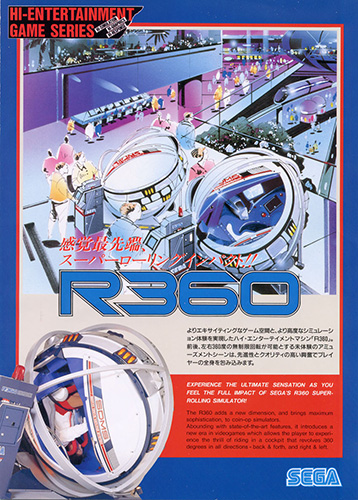 - よりエキサイティングなゲーム空間と、より高度なシミュレーション体験を実現したハイ・エンターテイメントマシン「R360」。 ジェット戦闘機ドッグファイトシミュレーションゲーム「G-L.O.C.」のソフトウェアをベースに、 新たに「R360」専用ソフトウェアとして開発された。体験モードとゲームモードの2パターンが用意されている。球形のコックピットを2軸で支えることにより、前後左右どの方向にも360度の無制限回転が可能。この画期的なムービング機構が新たなるアミューズメントシーンを創造。 キャビネットの台座に組み込まれたセンサーがプレイヤーと見物者の双方の安全を確保。コックピット・シートには、セイフティバーと4点式シートベルトを採用し、プレイ中のあらゆる動きからプレイヤーを確実に守る。また、プレイヤーの手足がコックピットから飛び出すと自動的に停止するムービングセンサーや内・外部に緊急停止ボタンなど、万全の安全対策を施されている。