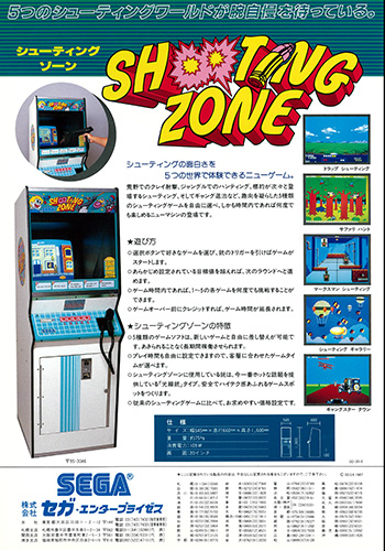 - 海外MSX用ソフトが内蔵されたガンシューティング。 クレー射撃、ハンティング、射撃練習場、気球の狙撃、銃撃戦という、5種のゲームから選択して楽しめる。設定スコアを超えれば次へと進むが、一定時間で終了。 採用されている銃は、当時話題になっていた「光線銃」タイプであった。 12月には同じ筐体に8方向レバーと2ボタンを取り付け、新たにマークⅢ版『アウトラン』などを遊べる『シューティングゾーン2』が発売された。