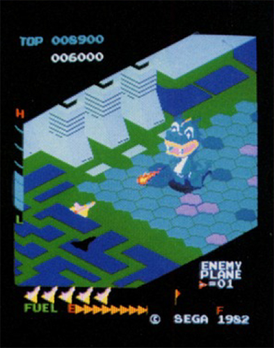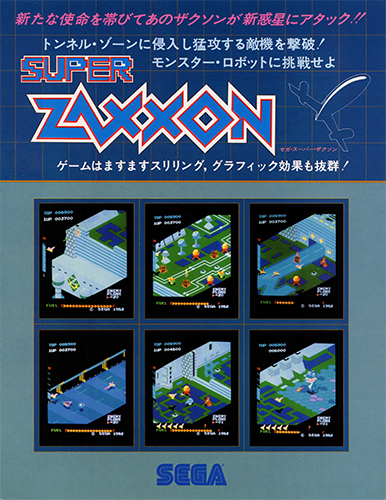 - シューティングゲーム『ザクソン』のアッパーバージョン。 敵宇宙基地に侵入し施設を攻撃、破壊する。オイルタンクを爆発させると燃料が補給され、燃料がなくなると一機失われる。 今作から、破壊不能な浮遊機雷を避けて進むトンネルゾーンを新たに追加。その他ファイヤーボール、ホーミングミサイルが加わり、地上物の配置も変わっている。敵本拠地では、巨大な怪獣型ロボットであるモンスターロボットが待ち構えており、口に6発撃ちこむと破壊できる。3回破壊すると次のラウンドに進める。