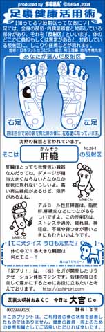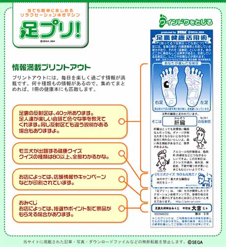 - 筐体は足用のリラクゼーションマシンと、プリンター内蔵のコントロールボックスで構成されている。 足用リラクゼーションマシンに足を入れ、料金を投入しスタートボタンを押すと、付属のコントローラーが動き出す。 時間終了後、足裏の反射区についての説明と健康クイズ、おみくじが印刷された「足裏健康活用術」がプリンターから印刷され、持ち帰ることができる。