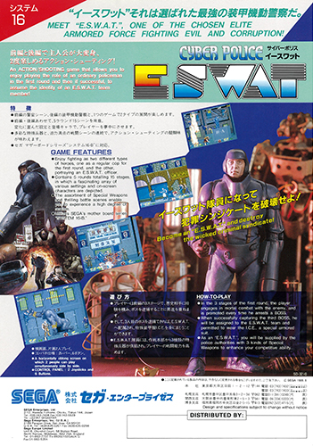 - 近未来における特殊部隊と犯罪組織との戦いを描いたジャンプアクション。 全5ラウンドで、1ラウンドは3ステージで構成。ラウンド2以降は主人公が警官から強襲装甲機動隊E-SWAT隊員に昇格し、装備が強力になる。E-SWATになるとハンドガンがガトリングガンになり、メガボム、マルチランチャー、プラズマ砲の3種の特殊武器を使用可。前編と後編で主人公が大変身する、二度楽しめるアクション・シューティングだ。