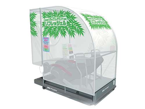 - 動きとサウンド演出が融合した、今までにないリラックス+遊体験ができる体感マシン。 ほっとできる個室感覚の空間の中で、5~15分間のリラクゼーションが楽しめる。コースは6種類。サウンドストーリーと連動するコースには、「ゴールデン・ハイテクコース」「究極の癒し幻の温泉コース」「ビーチリゾート・ヒーリングコース」の3種類用意されており、美人女将のいる温泉や世界の有名リゾートに来ている気分等を味わいながらのリラクゼーションが体感できる。 サウンドと連動していないコースには「全身たっぷりフルコース」「肩の辺り重点的コース」「指でぎゅーっとコース」の3種類用意されている。